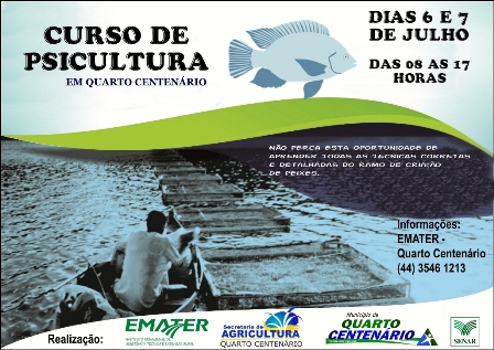 A Emater/Pr, em parceria com a Secretaria Municipal de Agricultura, prefeitura municipal e SENAR , abriu inscrições para o curso de psicultura, que será realizado nos dias 6 e 7 de julho das 08 as 17 horas.