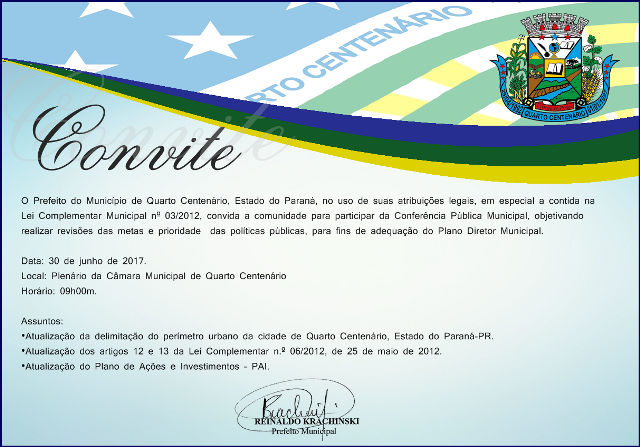 O Prefeito do Município de Quarto Centenário, Estado do Paraná, no uso de suas atribuições legais, em especial a contida na Lei Complementar Municipal nº 03/2012, convida a comunidade para participar da Conferência Pública Municipal, objetiva...